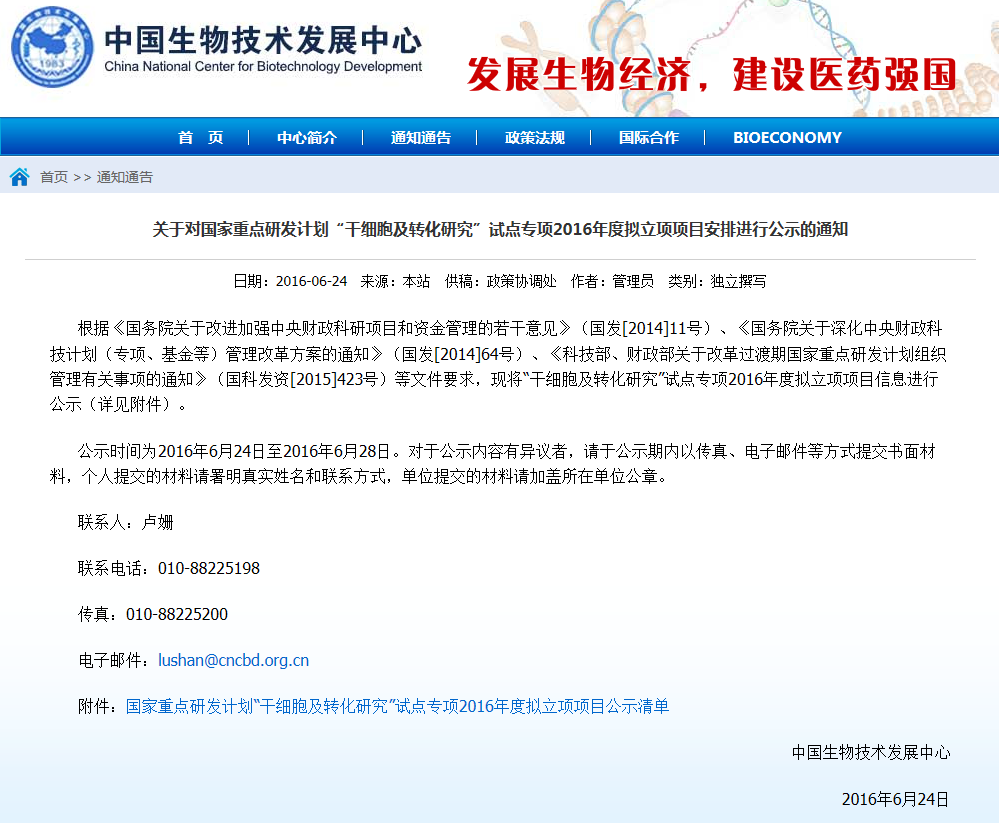 按照《干細(xì)胞臨床研究管理辦法(試行)》要求,國家干細(xì)胞臨床研究專家委員會對各地報送的干細(xì)胞臨床研究機構(gòu)備案材料進(jìn)行了審核,根據(jù)專家委員會意見,形成了干細(xì)胞臨床研究機構(gòu)首批通過備案的建議名單(見附件)。 從即日起至2016年6月8日對擬備案機構(gòu)進(jìn)…